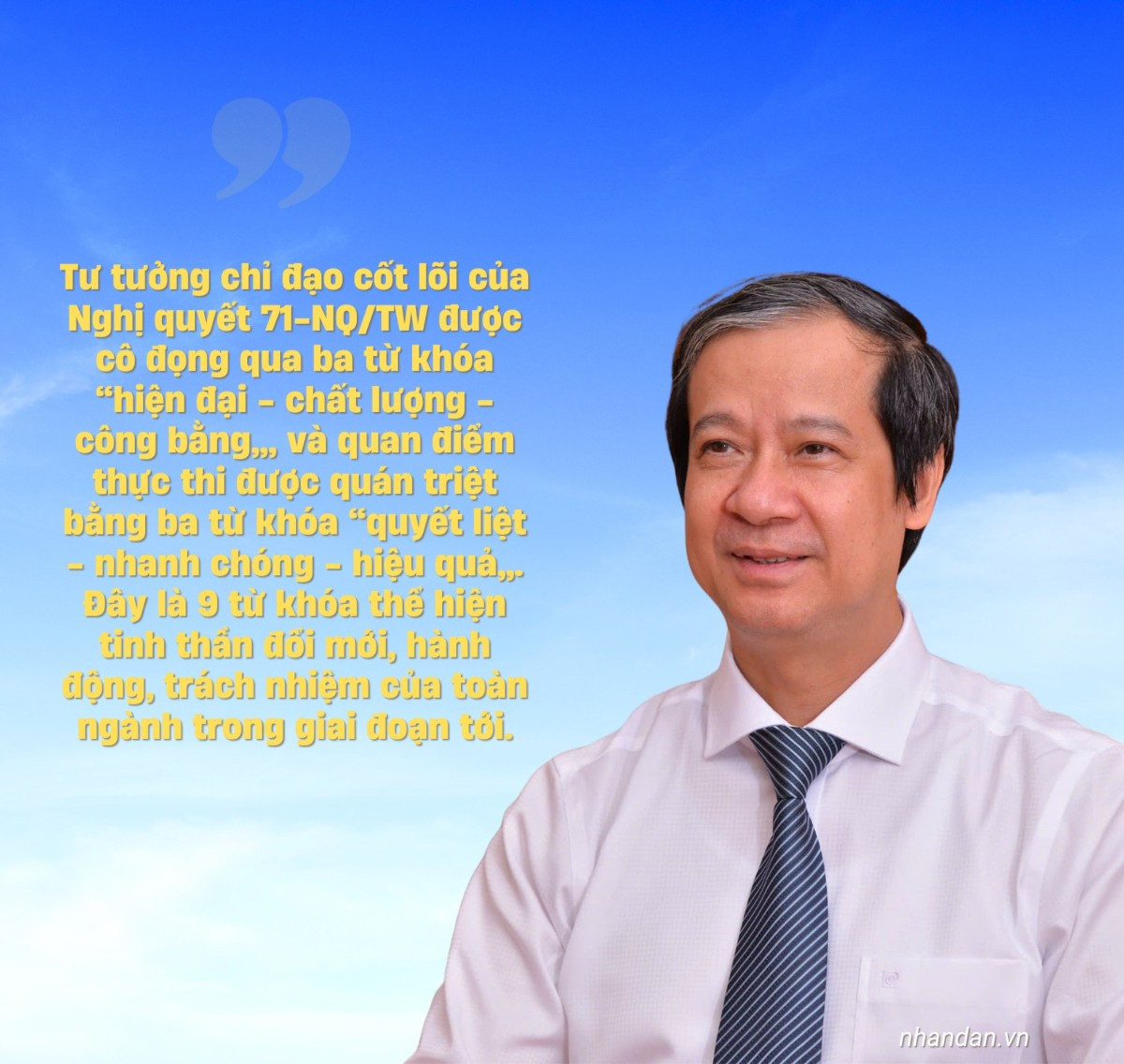 Bộ trưởng Giáo dục và Đào tạo Nguyễn Kim Sơn trao đổi cùng phóng viên Báo Nhân Dân về bước chuyển mạnh mẽ của giáo dục và đào tạo, cùng ba từ khóa “hiện đại – chất lượng – công bằng” – theo tư tưởng chỉ đạo cốt lõi của Nghị quyết 71-NQ/TW.