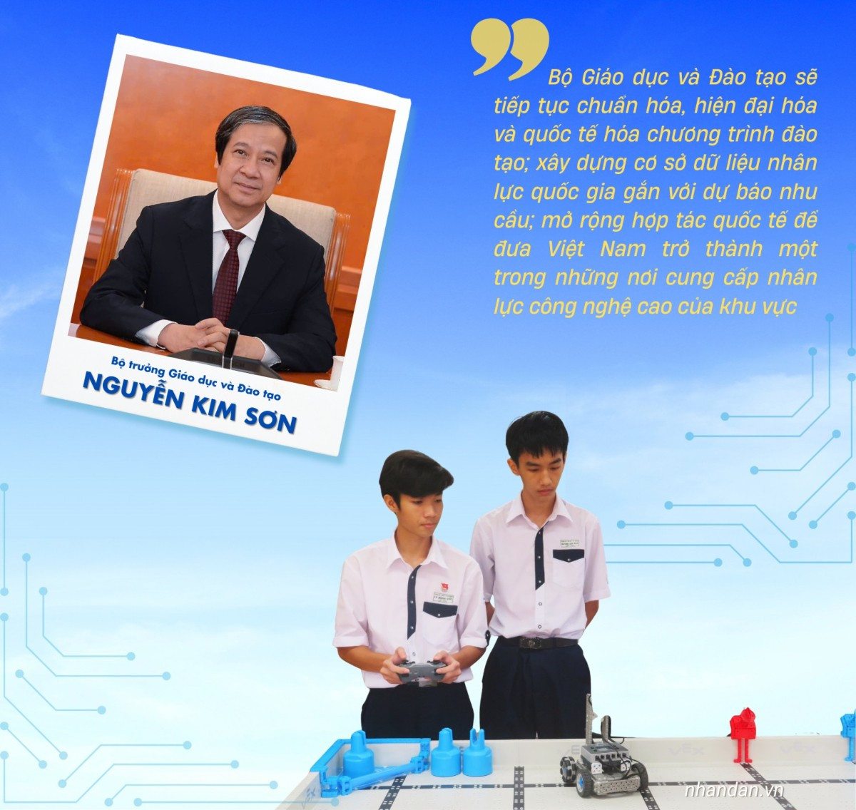 Trong thời gian tới, Bộ Giáo dục và Đào tạo sẽ tiếp tục chuẩn hóa, hiện đại hóa và quốc tế hóa chương trình đào tạo; xây dựng cơ sở dữ liệu nhân lực quốc gia gắn với dự báo nhu cầu; mở rộng hợp tác quốc tế để đưa Việt Nam trở thành một trong những nơi cung cấp nhân lực công nghệ cao của khu vực.