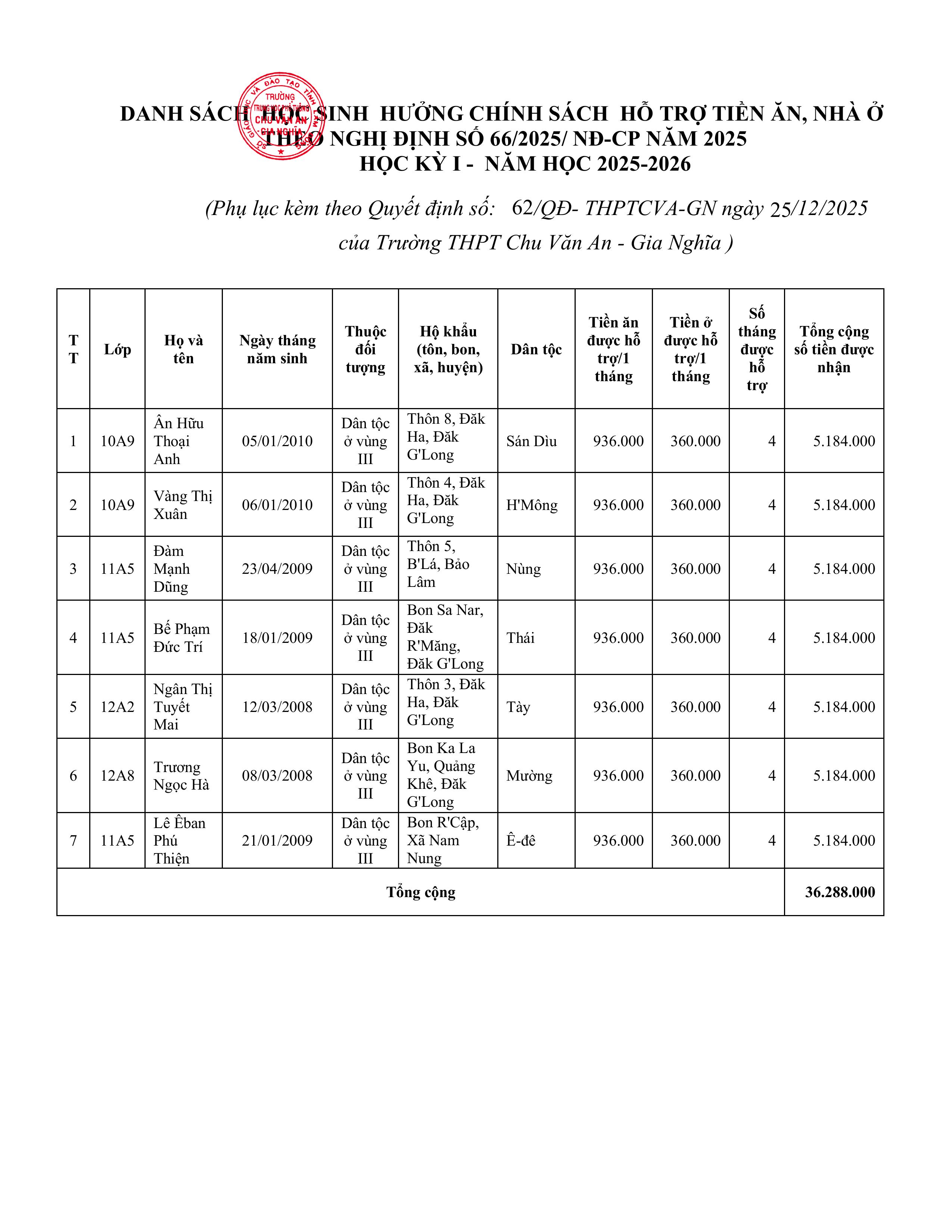 Công khai danh sách học sinh thuộc đối tượng hưởng chính sách theo Nghị định số 66/2025/NĐ-CP ngày 12/3/2025 của Chính phủ học kỳ I năm học 2025 – 2026