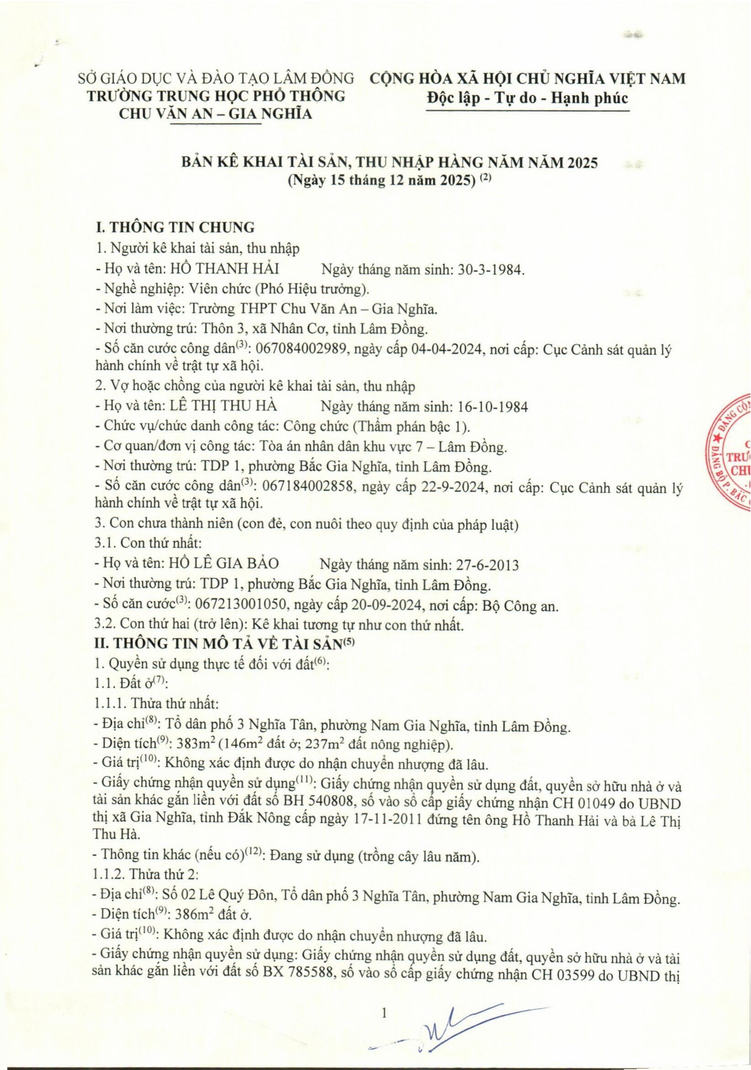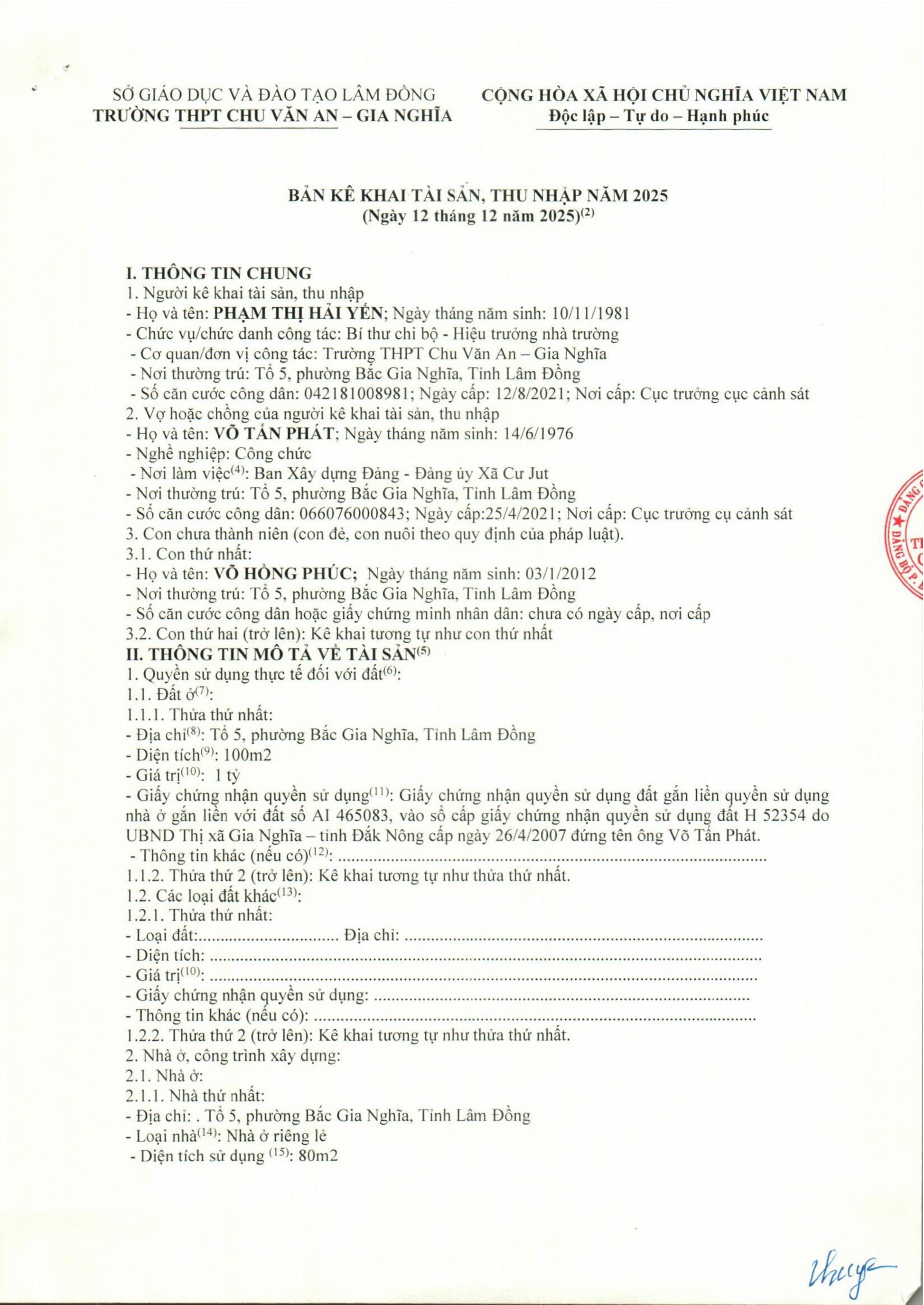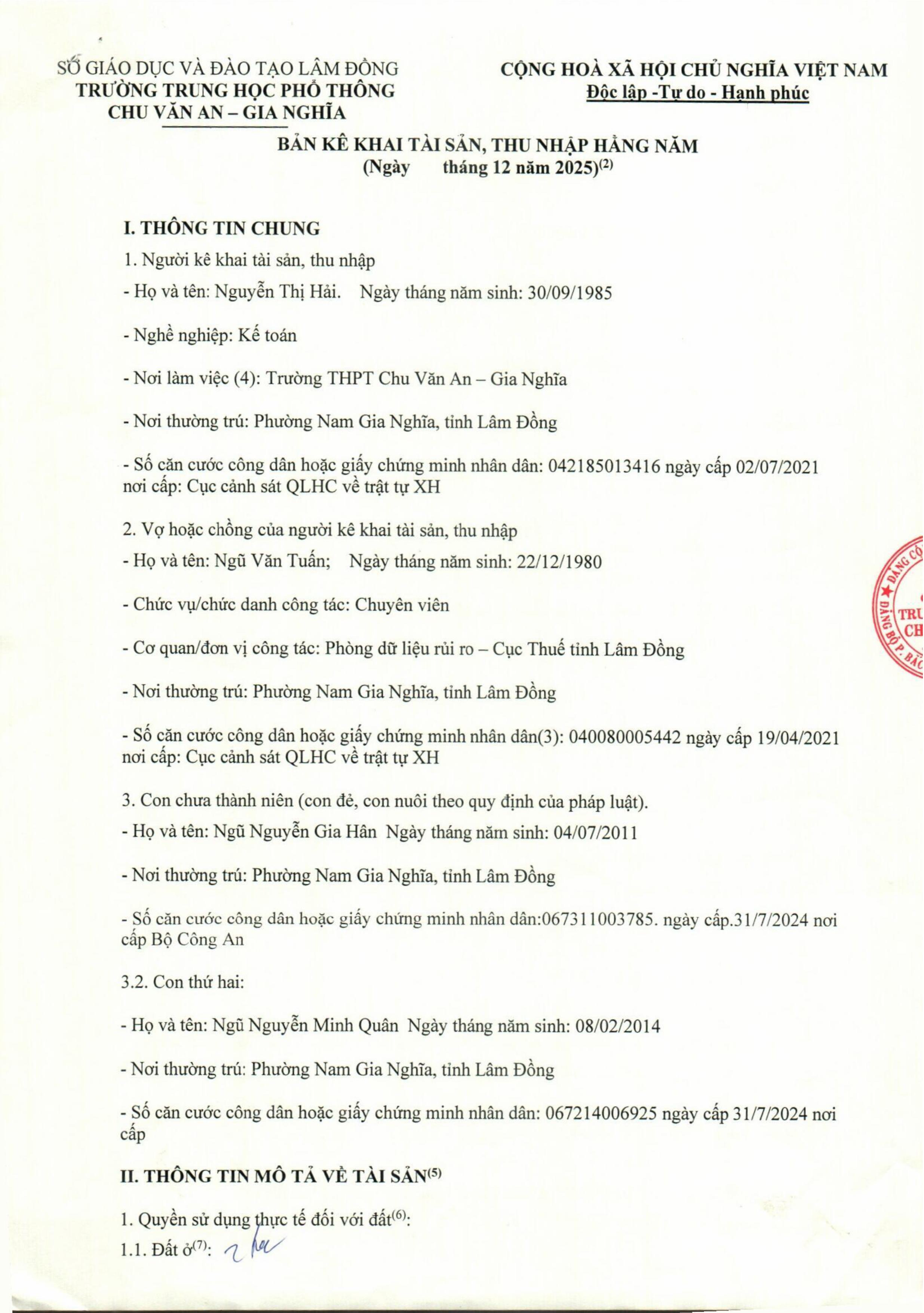 Công khai tài sản của Lãnh đạo nhà trường và Kế toán năm 2025