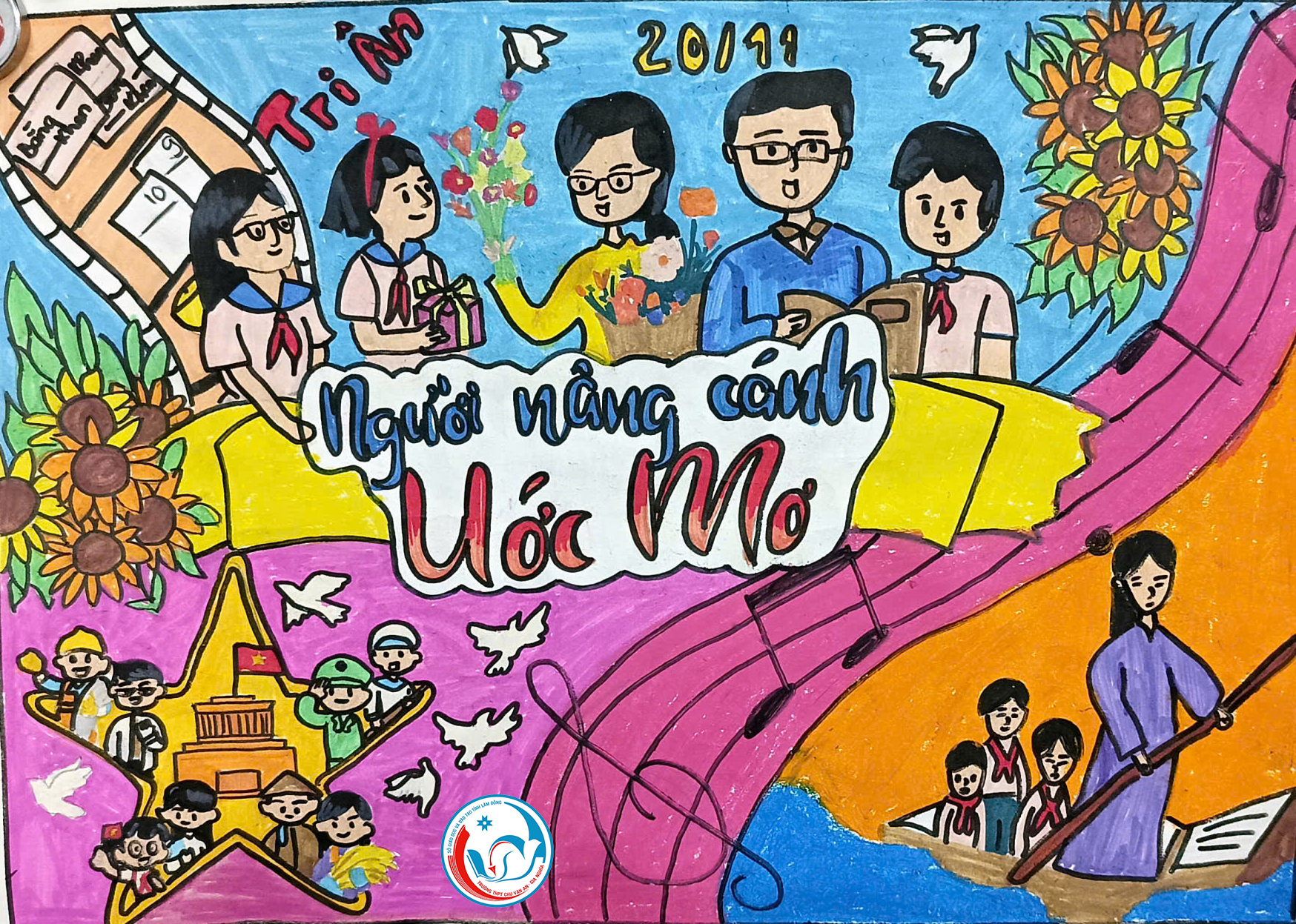 Những bức vẽ rực rỡ sắc màu, phong phú trong ý tưởng đã tái hiện hình ảnh người thầy – người cô qua nhiều góc nhìn đầy trân trọng: có tác phẩm khắc họa thầy cô miệt mài bên trang giáo án, có bức gợi lại dáng đứng lặng lẽ của thầy cô giữa sân trường đầy nắng – nơi bao thế hệ học trò đã lớn lên. Một số tranh tái hiện lại không gian quen thuộc của mái trường: những dãy lớp học thân thương, con đường rợp bóng cây, sân trường rộn tiếng cười hay sân khấu biểu diễn văn nghệ trong các ngày hội của thầy trò.