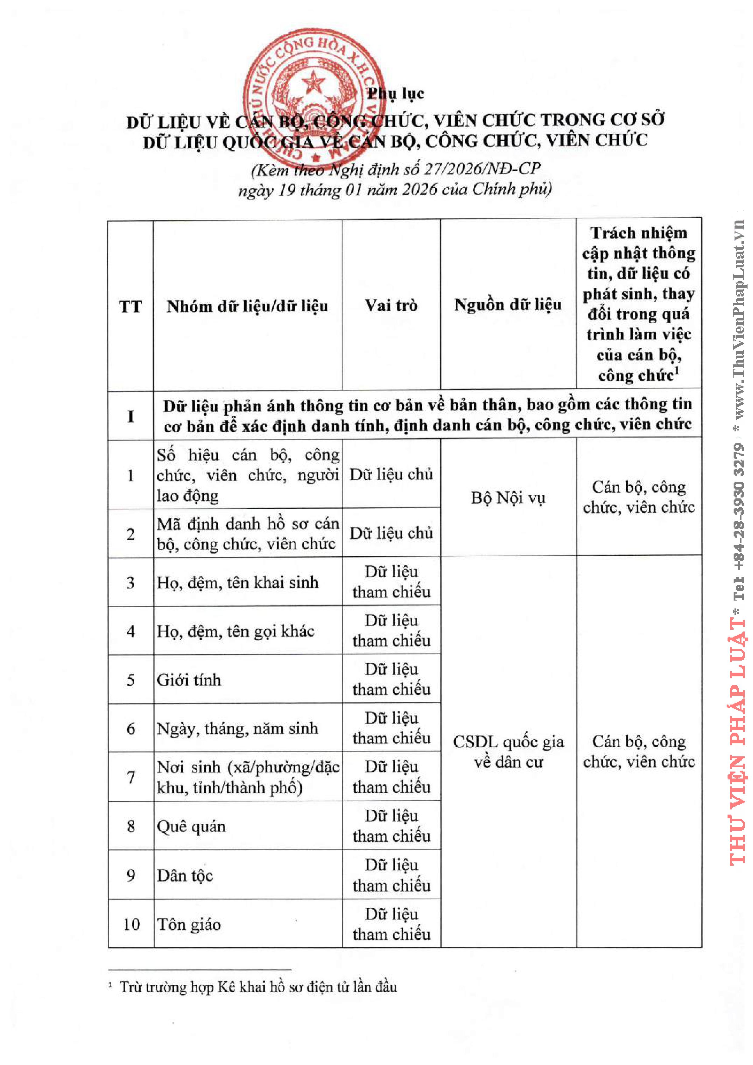 Nghị định số 27/2026/NĐ-CP ngày 19/01/2026 của Chính phủ về Cơ sở dữ liệu Quốc gia về Cán bộ, công chức, viên chức.