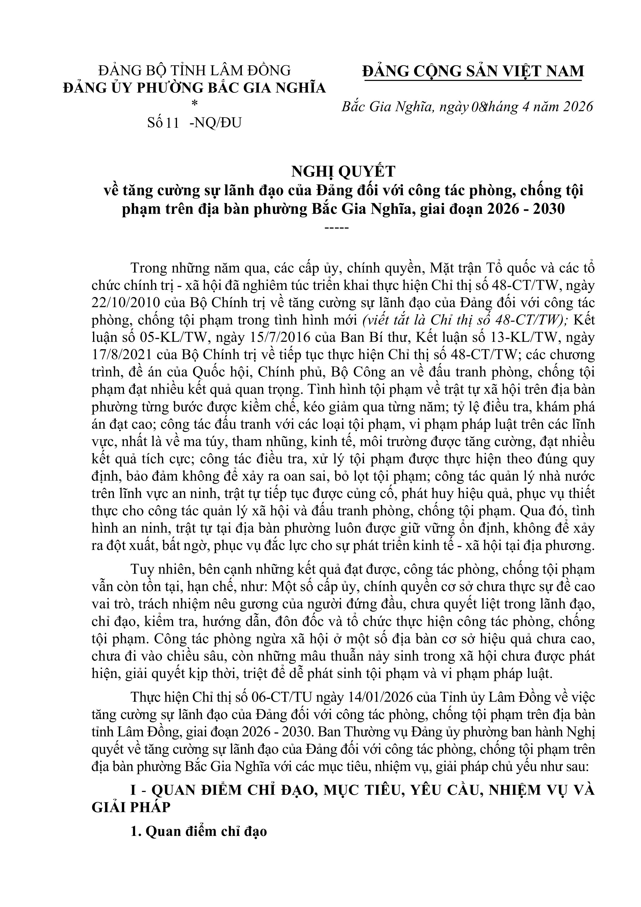 Nghị quyết về tăng cường sự lãnh đạo của Đảng đối với công tác phòng, chống tội phạm trên địa bàn phường Bắc Gia Nghĩa, giai đoạn 2026 – 2030