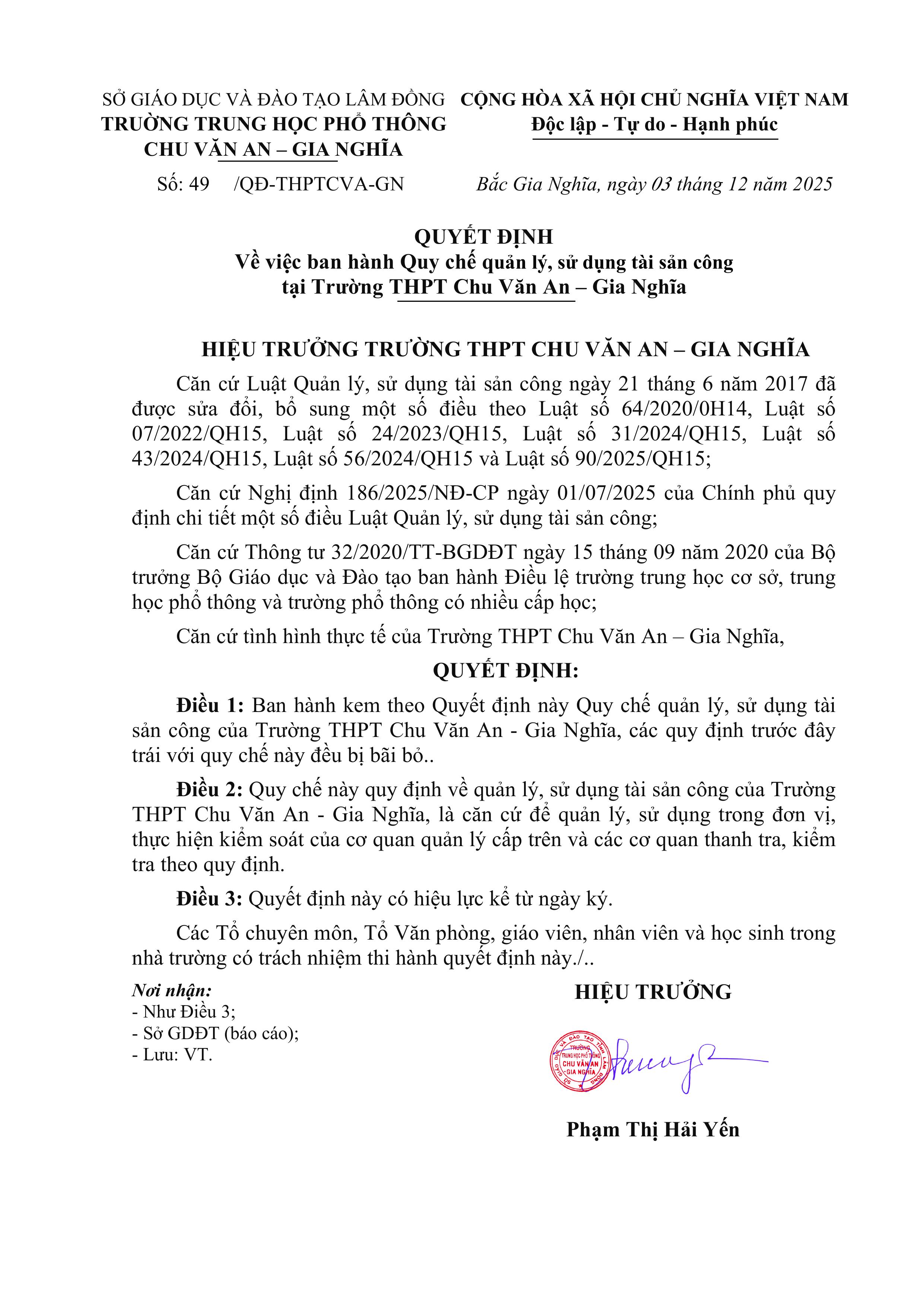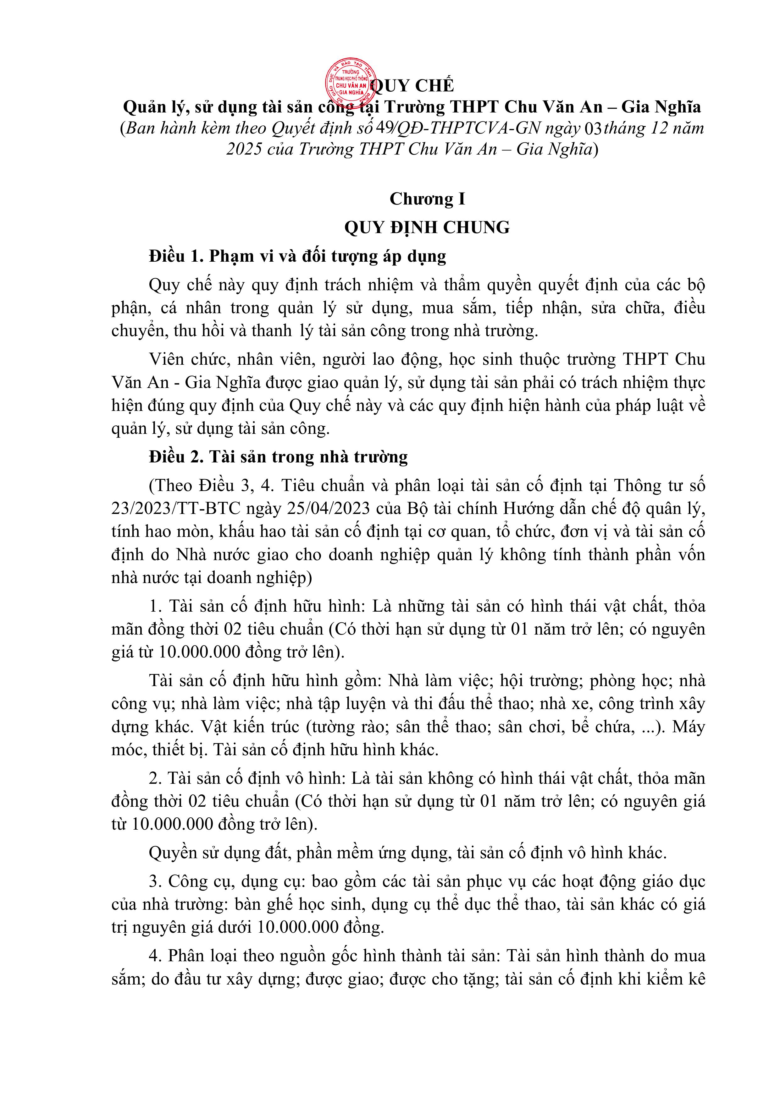 Quy chế quản lý, sử dụng tài sản công tại Trường THPT Chu Văn An – Gia Nghĩa