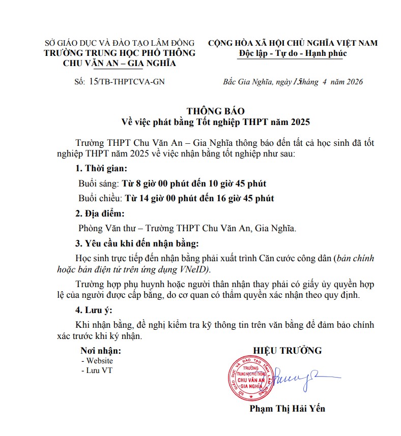 • Thông báo về việc phát bằng tốt nghiệp THPT năm 2025