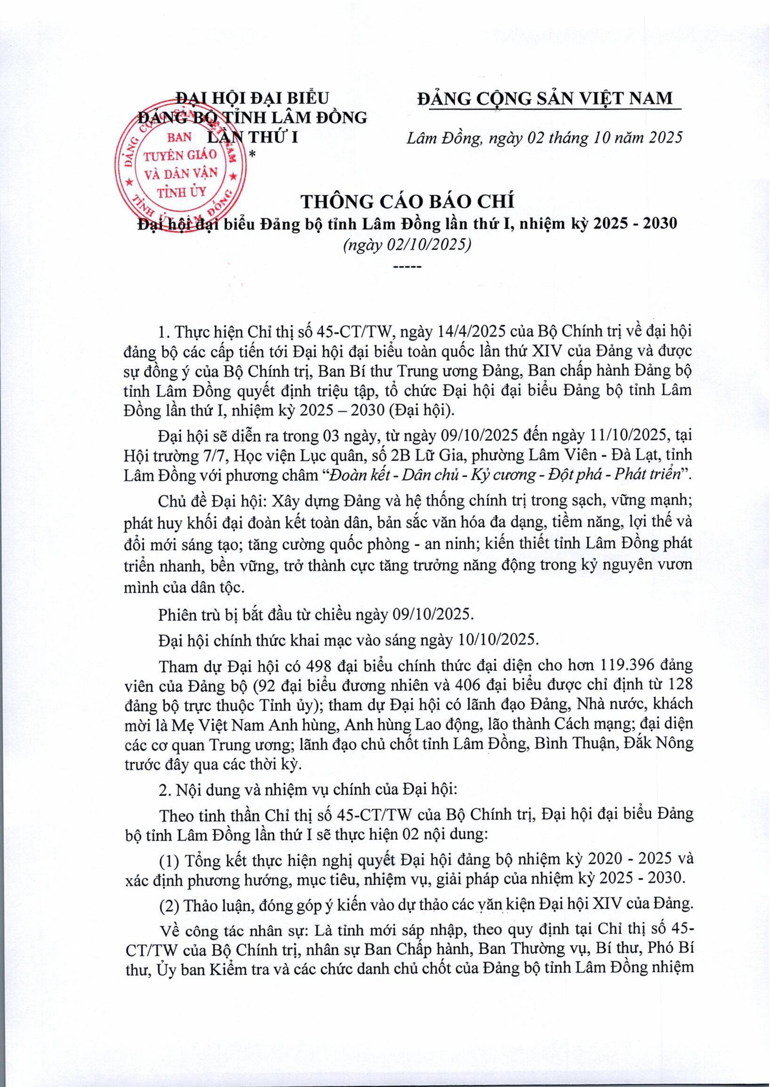 3. Thông cáo báo chí Đại hội đại biểu Đảng bộ tỉnh Lâm Đồng lần thứ I, nhiệm kỳ 2025-2030 (ngày 02/10/2025)