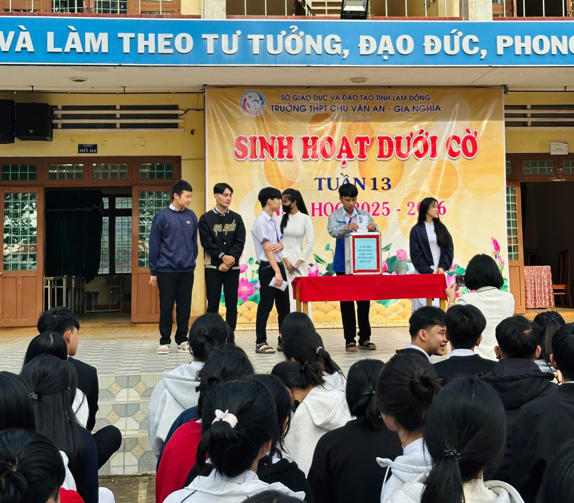 Trước tình hình mưa lũ kéo dài gây thiệt hại nghiêm trọng tại nhiều địa phương, sáng ngày 01 tháng 12 năm 2025, Trường THPT Chu Văn An – Gia Nghĩa đã tổ chức chương trình quyên góp ủng hộ đồng bào bị ảnh hưởng thiên tai, thể hiện tinh thần sẻ chia và mong muốn tiếp thêm nghị lực cho bà con vùng lũ vượt qua khó khăn.