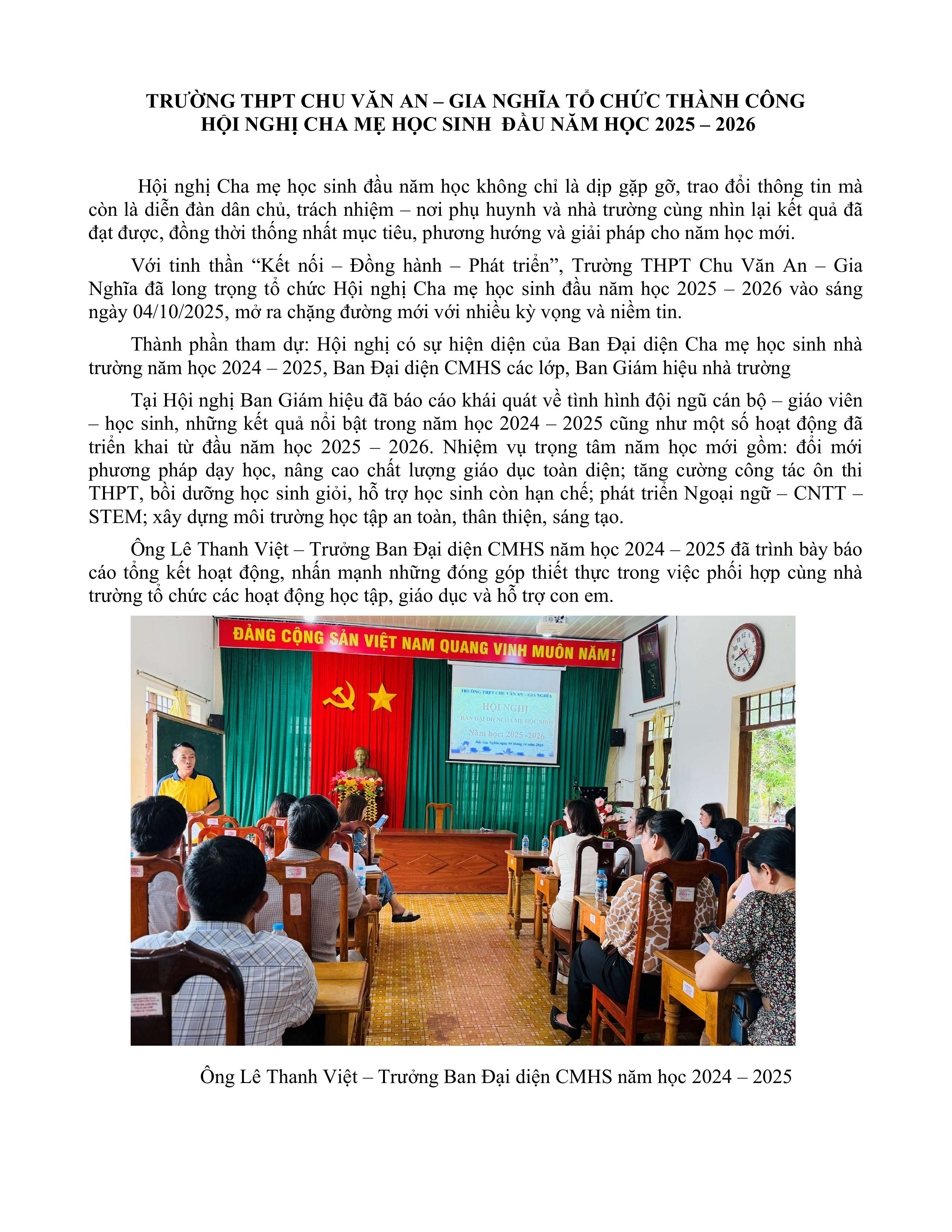 • TRƯỜNG THPT CHU VĂN AN – GIA NGHĨA TỔ CHỨC THÀNH CÔNG  HỘI NGHỊ CHA MẸ HỌC SINH  ĐẦU NĂM HỌC 2025 – 2026